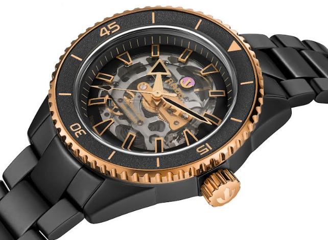 Roshan unveils the Rado Captain Cook High-Tech Ceramic Skeleton, presented for the first time in a matt black monobloc case with rose-gold embellishments. Through its black-tinted box-shaped sapphire crystal and beyond its bold hands and indexes – all brushed rose-gold-coloured, with black Super-Luminova – its Rado calibre R808 automatic movement can be glimpsed, featuring a rose-gold-coloured centre wheel bridge.