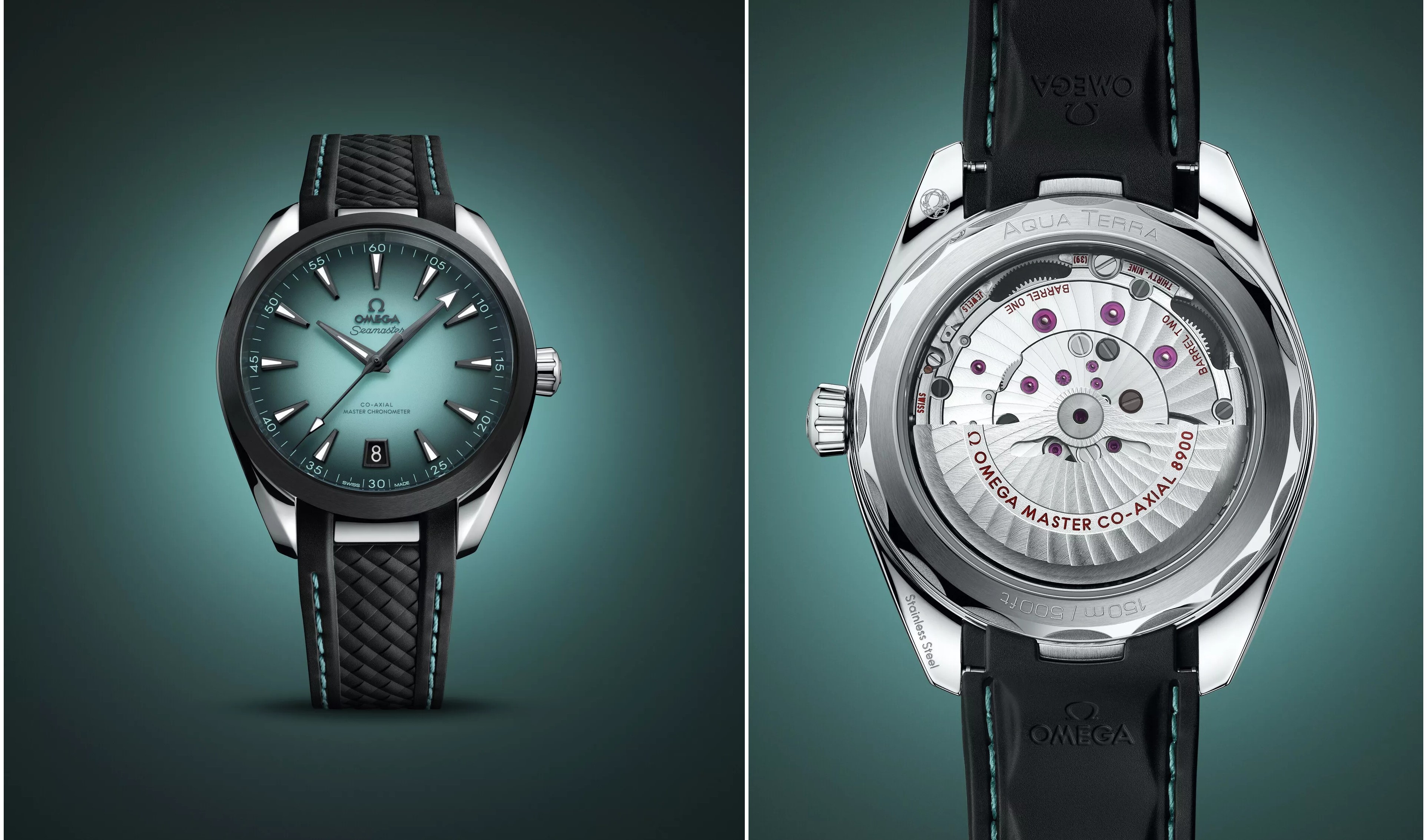 OMEGA SEAMASTER AQUA TERRA TURQUOISE DIAL CERAMIC BEZEL RUBBER STRAP 38MM 41MM CO-AXIAL MASTER CHRONOMETER CALIBRE 8900 CALIBRE 8800 SUPER-LUMINOVA 15 000 GAUSS METAS CERTIFICATION 60 HOURS POWER RESERVE 55 HOURS POWER RESERVE WATER RESIST NATIONAL
