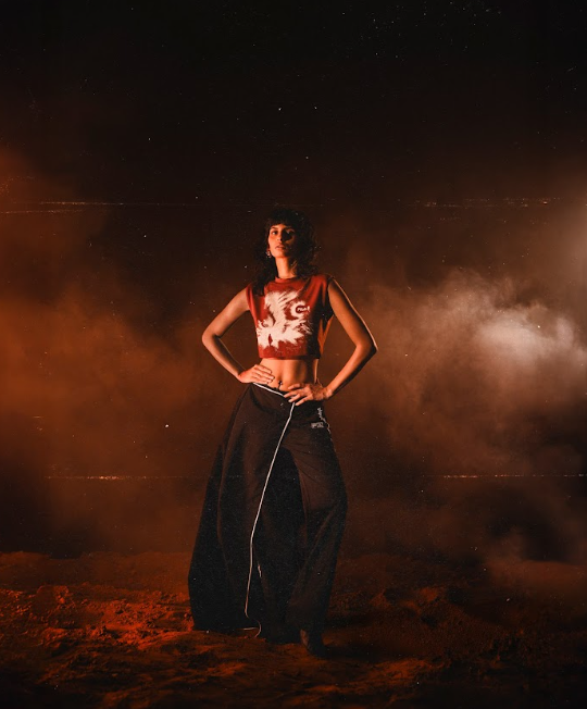 At the heart of the collaboration is a fictional sandstorm universe, a brutalist desert world shaped by swirling dust, eclipse-lit skies, and twisted flora. Garments are designed to feel like relics retrieved from this imagined terrain, moving through tones of ash, oxidised red, and iron. The silhouettes lean into utility, ritual, and layered proportions.