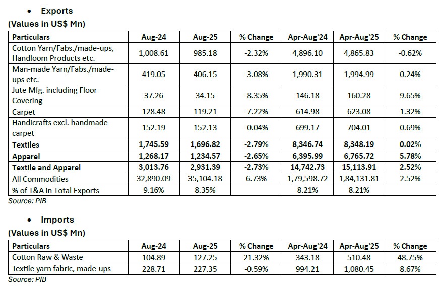 INDIAN TEXTILES APPAREL EXPORTS DEGROWTH AUGUST 2025 GROWTH APRIL-AUGUST 2025 YEAR-ON-YEAR EXPORT PERFORMANCENATIONAL