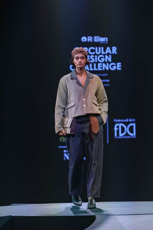 The CRCLE label was launched by Varshne B after graduating from the National Institute of Fashion Technology, Chennai. Her collection “Symbiosis” was committed to sustainability, which offered unisex fashion that had a timeless function. Using 100 per cent biodegradable Wegawool from the Calotropis plant fibres, along with banana leather, hand made Korai grass bags, naturally dyed textiles, handwoven khadi denim in kala cotton and repurposed cotton textiles. The collection had a clean-cut silhouette that was precisely structured in earthy colours and stainless-steel scrap accessories with post-consumer fabrics. Championing the use of waste, Varshne has a 360-degree insight when it comes to the use of waste and turning it into useful fashionable attire, which had tags and trims that were reused or recycled. The “Symbiosis” collection from Varshne B for her brand CRCLE projected conscious style luxury that fitted ideally into the Circular design movement.