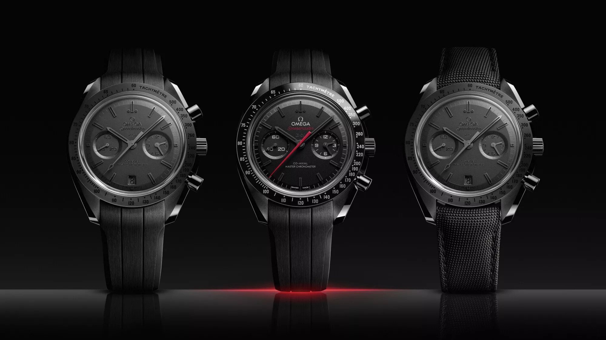 - An all-black model features the Black Edition Co-Axial Master Chronometer Calibre 9900 with darkened movement components and enamel tachymeter scale. The ceramic dial showcases laser sandblasting with diamond-polished bevelled indexes filled with Super-LumiNova.