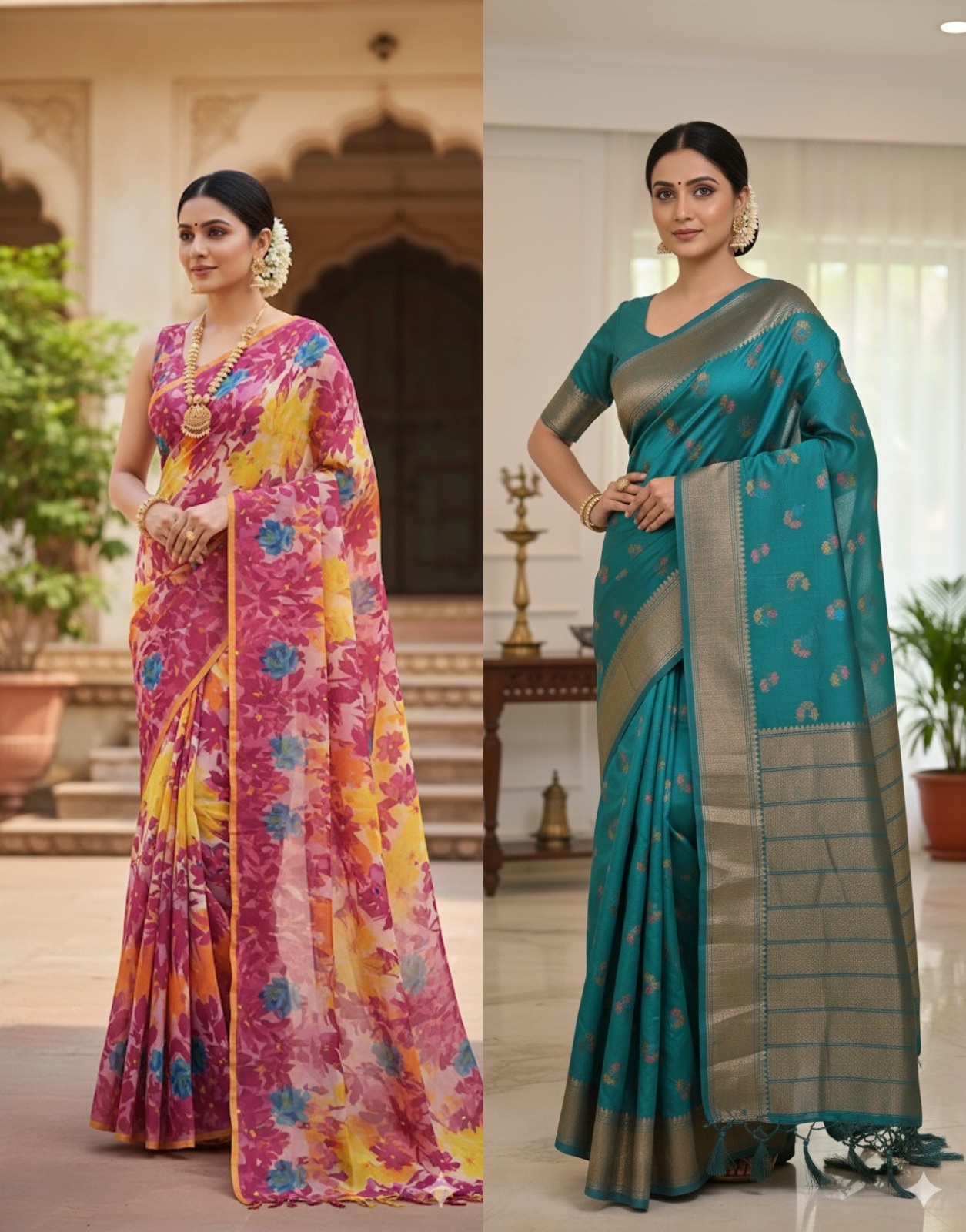 The collection showcases an exquisite range of sarees crafted from some of India’s most treasured fabrics. From the opulent Mysore Silk designs and the grandeur of Banaras Silk and Banaras Jari to the regal Paithani, vibrant Printed Georgettes, delicate Designer Sarees, and airy Chiffon Sarees, Indian Desi offers something to suit every occasion. Prices start from an accessible ₹1,299 and go up to ₹7,500, making the collection both aspirational and inclusive.