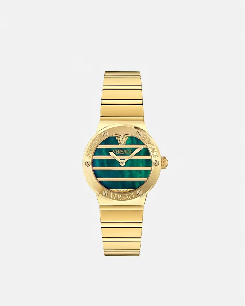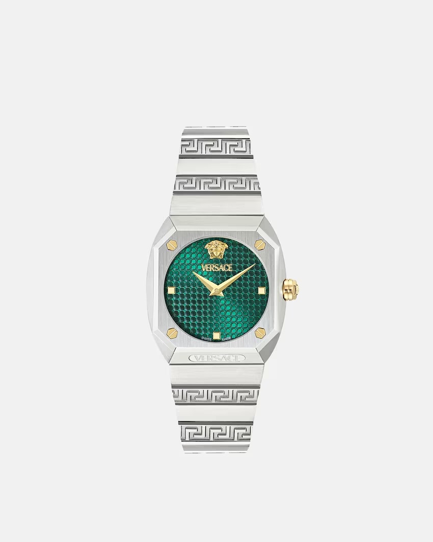 Versace Antlia Watch A modern classic that pairs Versace’s iconic Greca pattern with a striking green dial. The Antlia features a 34 mm stainless steel case crafted entirely from recycled materials, reflecting the brand’s commitment to conscious luxury. Swiss quartz movement ensures perfect precision, while the butterfly clasp bracelet adds an effortlessly refined finish.