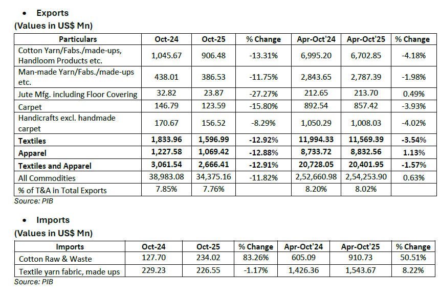 During Oct’25, Indian Textiles exports registered a degrowth of -12.92% over the previous year while Apparel exports registered a degrowth of -12.88% during the same time period. - Cumulative Exports of Textiles and Apparel during Oct’25 have registered a degrowth of -12.91% over Oct’24. - During Apr-Oct’25, Indian Textiles exports registered a degrowth of -3.54% over the previous year while Apparel exports registered a growth of 1.13% during the same time. - Cumulative Exports of Textiles and Apparel during Apr-Oct’25 have registered a degrowth of -1.57% as compared to Apr-Oct’24.