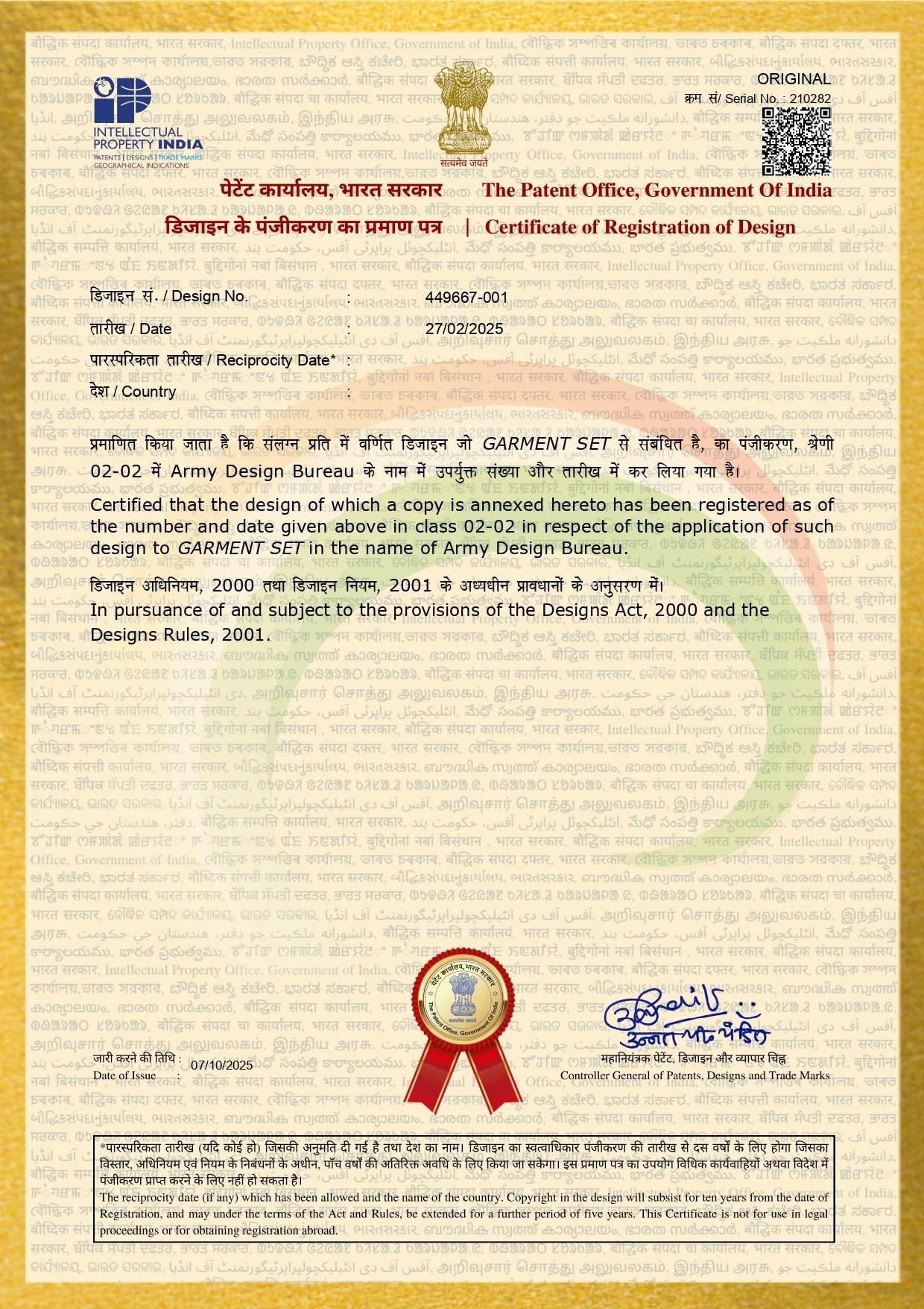 The Indian Army has successfully registered the design of the New Coat Combat (Digital Print) with the Controller General of Patents, Designs and Trademarks, Kolkata, under Design Application No. 449667-001, dated 27 February 2025 and published in the Official Journal of the Patent Office on 07 October 2025.