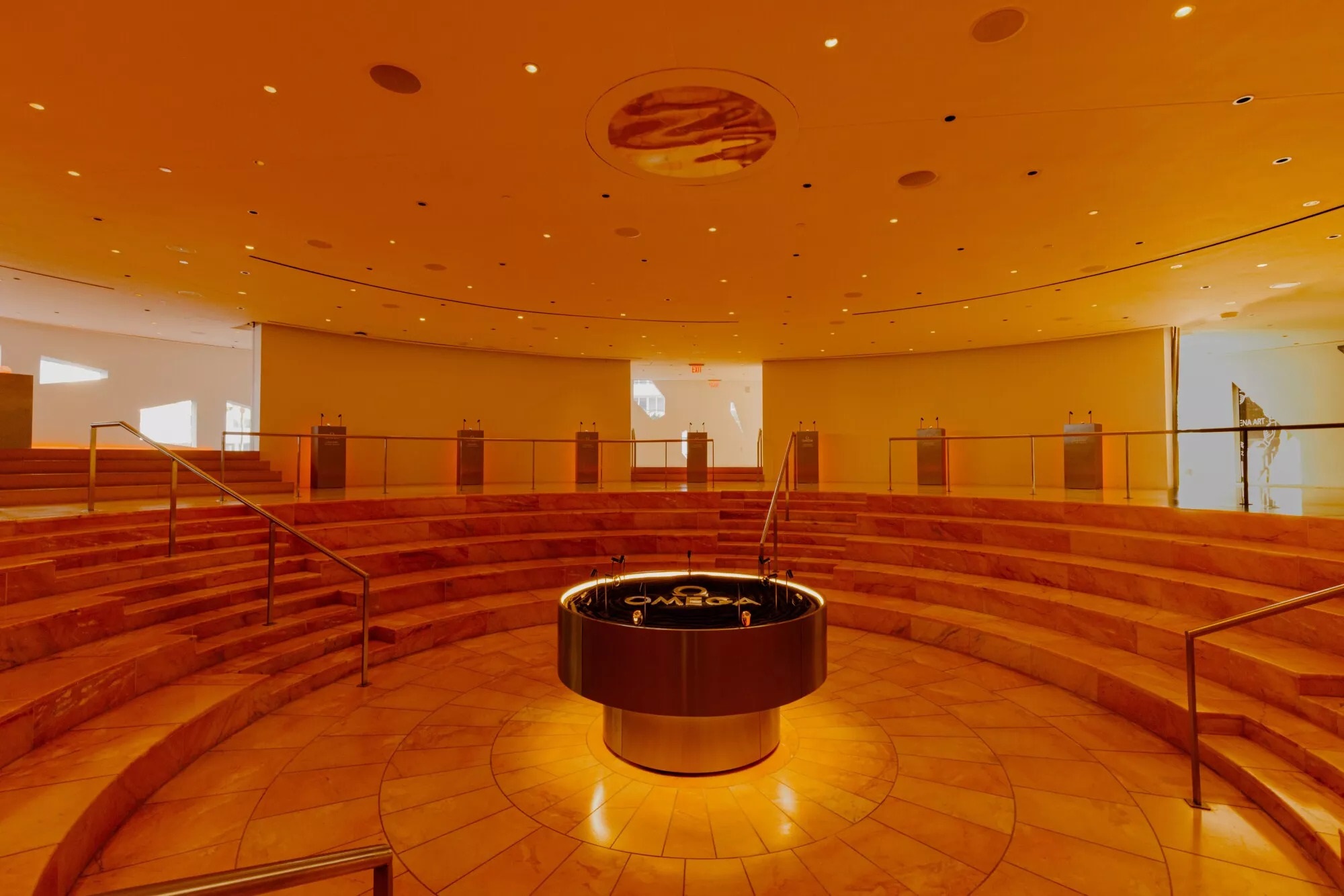 Inspired by the redesigned angles of the new Planet Ocean watches, the occasion came alive at the modern Faena Forum in Miami Beach – a venue renowned for its geometric architecture, distinguished by a striking cylinder form and façade of angular windows.