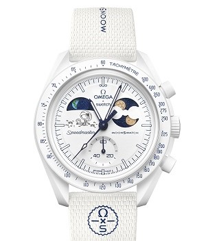 MISSION TO EARTHPHASE MOONSHINE GOLD COLD MOON SWATCH OMEGA X SWATCH SNOWFLAKE LASER BIOCERAMIC MOONSWATCH SPEEDMASTER MOONWATCH FEATURES SNOOPY ILLUSTRATION MOON PHASE INDICATOR WINTER EDITION LAUNCH DECEMBER 4 RELEASE LIMITED AVAILABILITY S GLOBAL