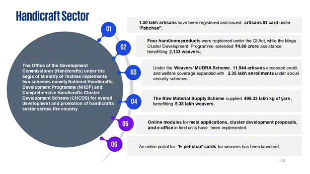 11.3 Under the Weavers’ MUDRA Scheme, 11,544 artisans accessed credit, and welfare coverage expanded with 2.35 lakh enrollments under social security schemes.