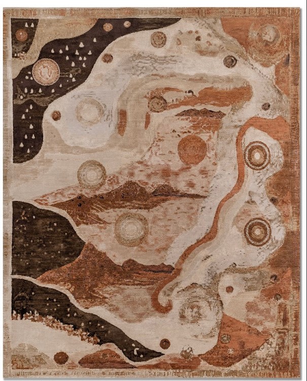 The Land of Beginnings Illuminated by the night sky, this rug evokes cosmic energy flowing through hills, valleys, and stars. Erosion, retreat, and rebirth unfold across its surface, chronicling creation and renewal. It is a vision of a land both fleeting and eternal, alive in imagination and remembrance.