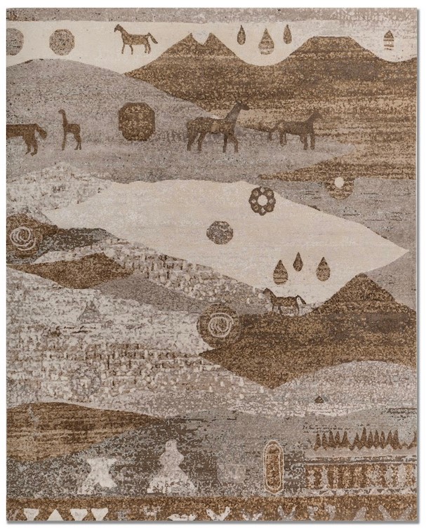 Cry of the Sands A meditation on mystery and movement, this rug reveals a desert seen through veils of sand and light. Subtle landmarks rise like half-remembered shelters, echoing the rhythm of wind and the quiet power of impermanence. Each weave whispers of passage, presence, and secrets held beneath shifting dunes.