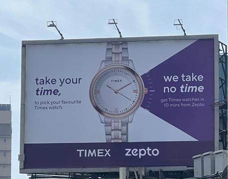 TIMEX ZEPTO QUICK COMMERCE Q-COMMERCE INDIA ANALOG WATCHES MAKE TIME YOURS OOH CAMPAIGN INTEGRATED MARKETING MUMBAI HOARDING LIFESTYLE CATEGORY INSTANT DELIVERY BRAND PARTNERSHIP URBAN MARKETS CONSUMER CONVENIENCE NATIONAL