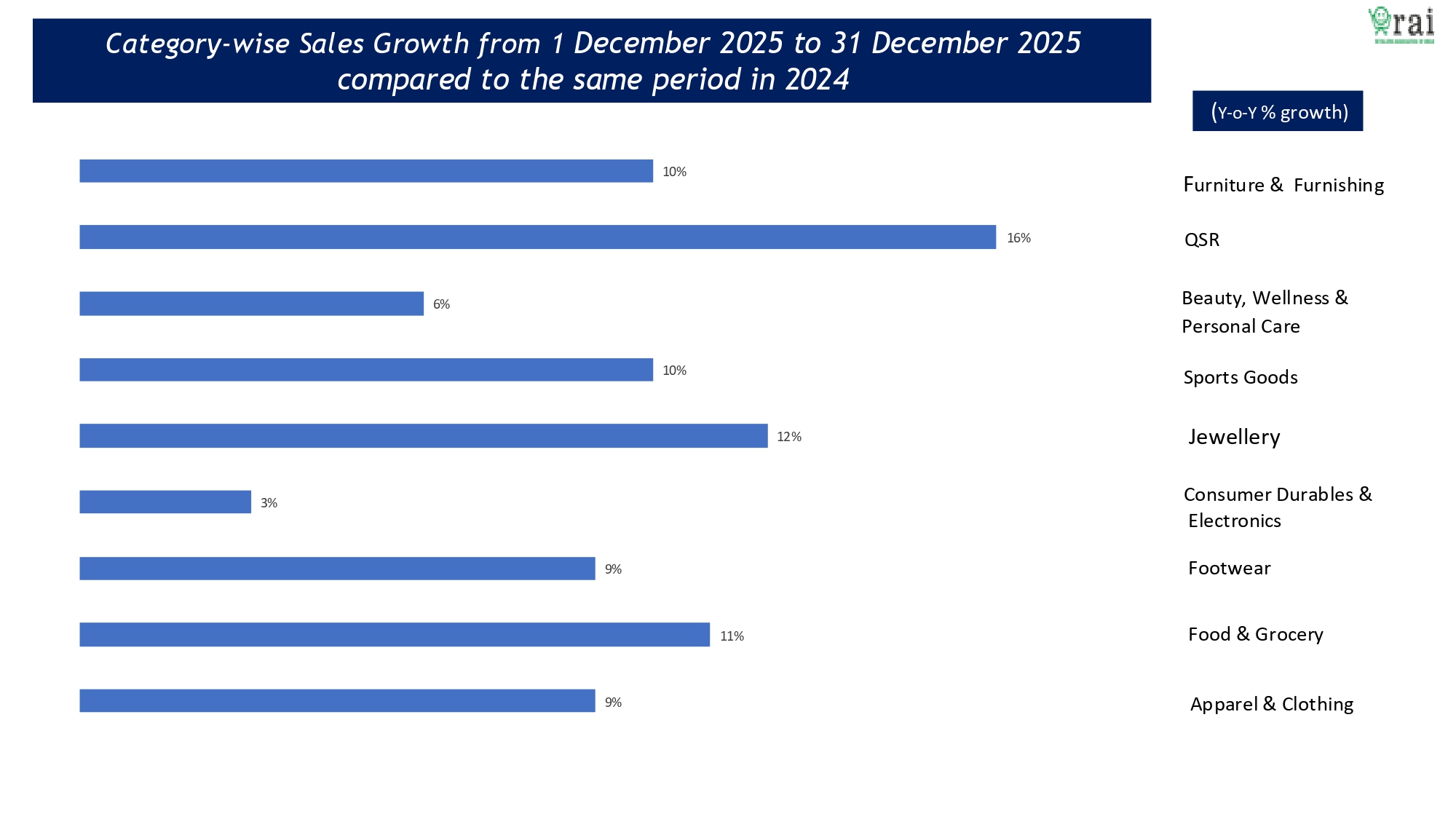 RAI RETAIL BUSINESS SURVEY DECEMBER 2025 RETAIL SALES 10 PERCENT GROWTH FESTIVE SEASON MOMENTUM REGIONAL RETAIL PERFORMANCE WEST INDIA 14 PERCENT QSR GROWTH 16 PERCENT JEWELLERY DEMAND GOLD PRICES RISE APPAREL GST IMPACT VALUE-CONSCIOUS CONSUMER NATIONAL