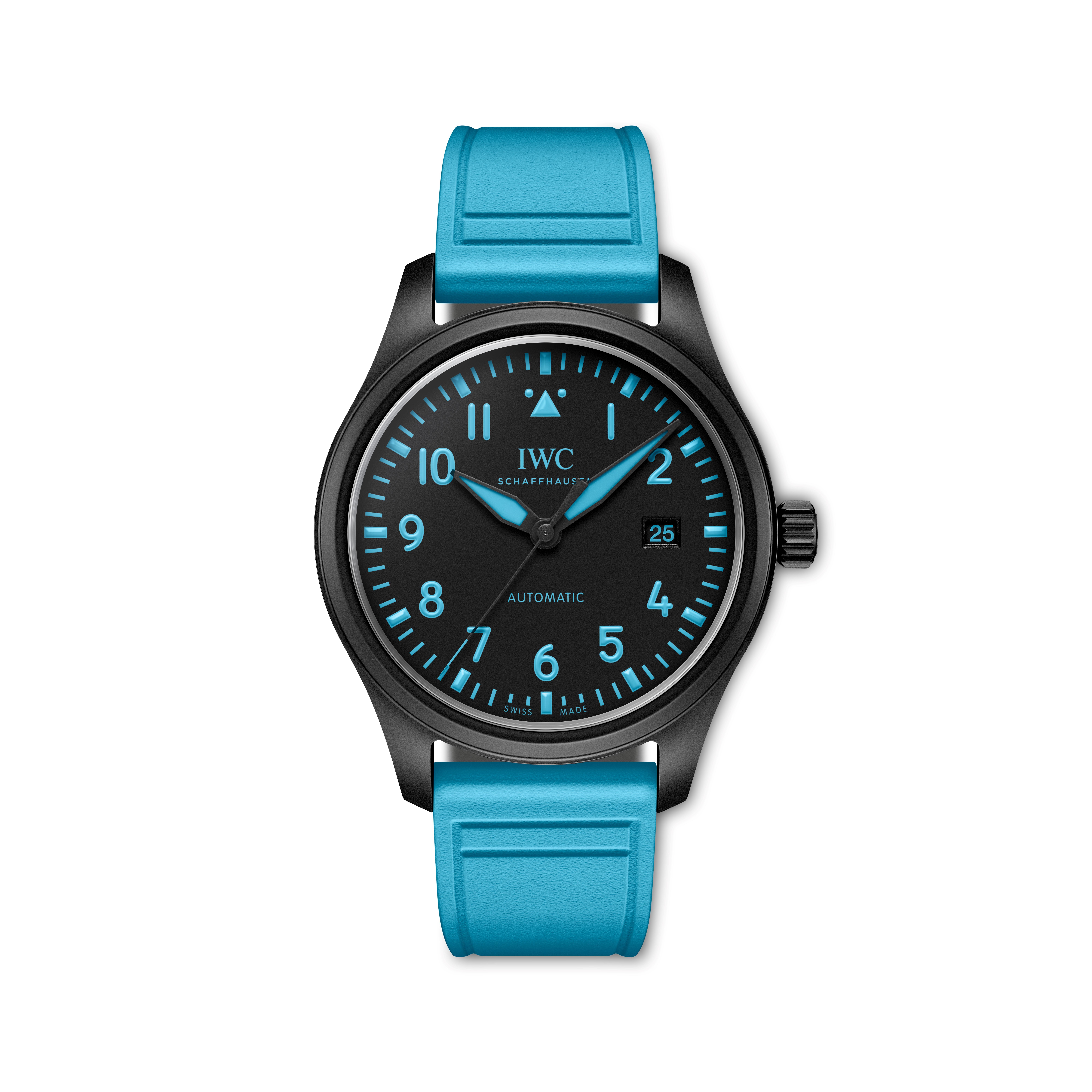 The Pilot’s Watch Chronograph 41 George Russell (Ref. IW389411) combines materials that are emblematic of the comprehensive expertise IWC has acquired since the 1980s. Its 41.9-millimetre case is crafted from black zirconium oxide ceramic, a material IWC pioneered four decades ago. Ceramic is lighter than steel and highly scratch-resistant, making it an attractive choice for watches. The crown and the pushers are made of Ceratanium, an IWC-developed material that combines the lightness of titanium with a hardness and scratchresistance similar to that of ceramic. The black dial features indices and numerals printed in George Russell’s signature blue shade. The black hands are filled with Super-LumiNova in the same colour. The chronograph is powered by the IWC-manufactured 69380 calibre with a power reserve of 46 hours.