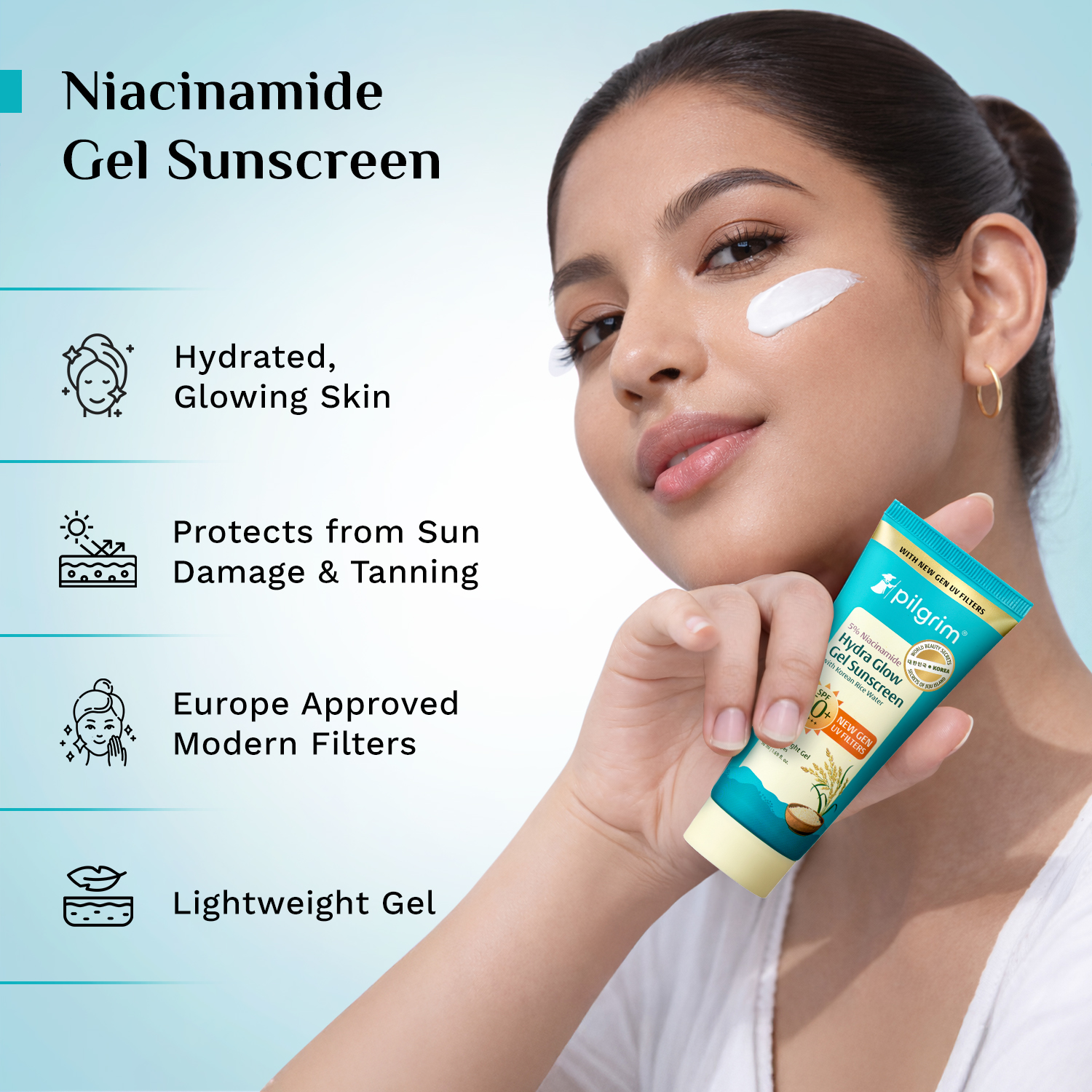 PILGRIM 5% NIACINAMIDE HYDRA GLOW GEL SUNSCREEN SPF 50+ PA++++ NEW GEN UV FILTERS UVSHIELD X™ TECHNOLOGY BROAD-SPECTRUM PROTECTION UVA UVB BLUE LIGHT UVINAL T 150 UVINAL A PLUS TINSORB S PHOTOSTABLE IN-VIVO & IN-VITRO TESTED KOREAN RICE WA NATIONAL