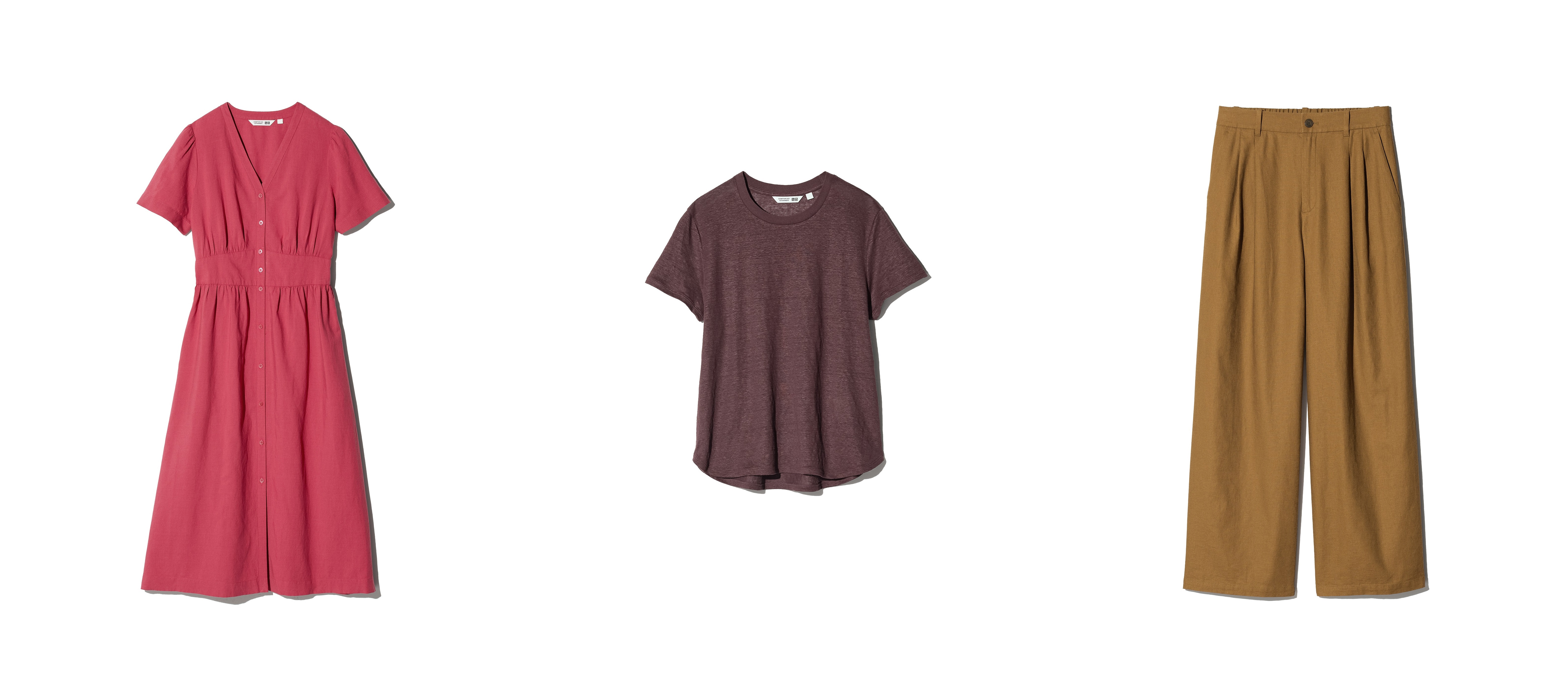 The wide variety of linen items includes bottoms that combine the refreshing feel of linen with the softness of cotton, as well as dresses and jumpsuits that complete a styling with just one piece. T-shirts offered in an array of colors allow wearers to enjoy the soft drape and comfortable texture unique to linen.