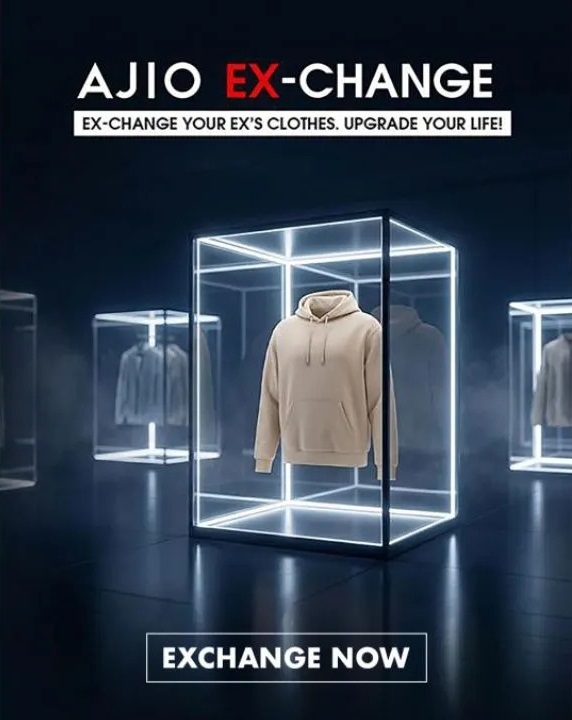 AJIO EX-CHANGE FASHION E-TAILER STORE CREDITS MOBILE APP FEATURE CLOTHING EXCHANGE EMOTIONAL DAMAGE ASSESSMENT RELATIONSHIP ALGORITHM BREAKUP CAMPAIGN DIGITAL RETAIL CUSTOMER ENGAGEMENT 6500 BRANDS 3 MILLION STYLES NATIONAL
