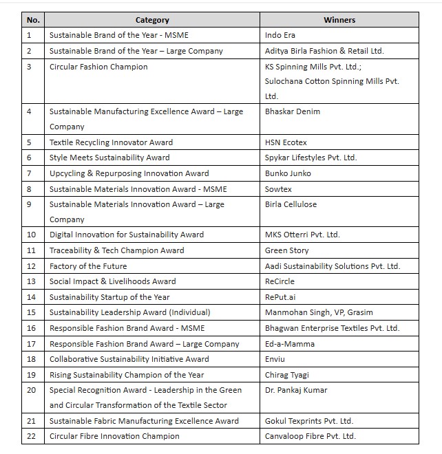 The Jury for the awards included stalwarts like Dr. Naresh Tyagi, CSO, ABFRL; Sanjay Rastogi, Business Head, Trent Ltd.; Radhika Kaul, Chief of Staff, UN RCO India; Manohar Samuel, SU.RE; Parvinder Kadyan, Chairman, GATS; Naveen Sainani, Hon. Gen. Secretary & Chairman, ESG at CMAI; Ankur Gadia, Vice President, CMAI; Darshana Gajare, Head of Sustainability, Lakmé Fashion Week, SU.RE, Circular Design Challenge; and Prof. (Dr.) Meenakshi Tomar, Vice Dean, Jindal Global Business School.